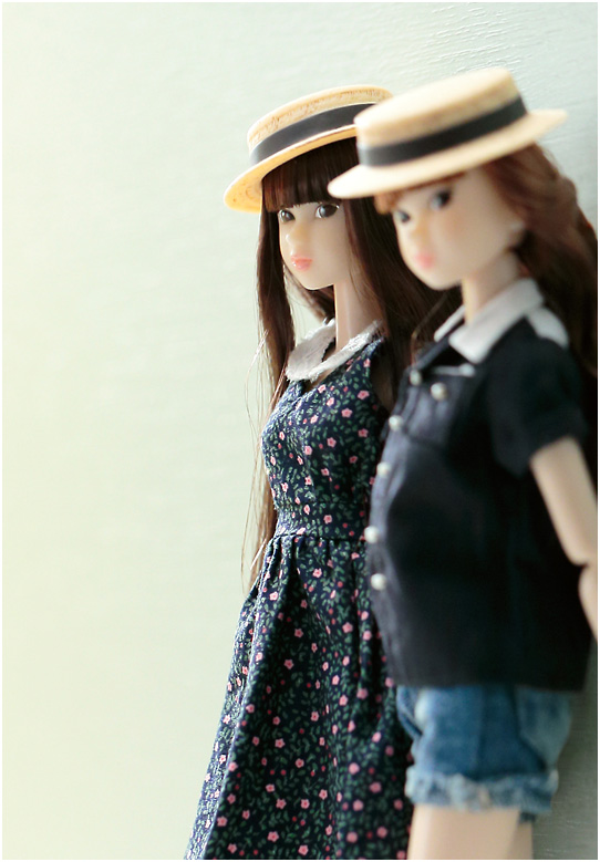 【左】Wake-Up momoko DOLL WUD008、STOCオリジナル ネイビー小花柄 ひざ丈ワンピース(Wake-Up momoko DOLL WUDsp付属)、レースつけ襟(Beautiful Lines付属)、ストローハット(STOC)